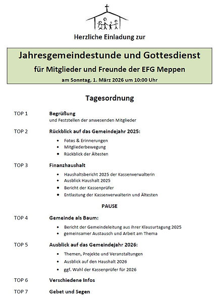 Zur normalen Gottesdienst-Zeit findet unsere Jahres-Gemeindestunde statt. Alle Mitglieder, Freunde und auch spontane Besucher sind eingeladen, dabei zu sein!